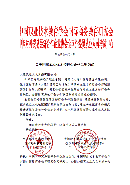 2015年6月10日经过前期的筹备,经中国职业技术教育学会国际商务教育研究会和中国对外贸易经济合作企业协会批准,由大连凯越文化传播有限公司与365英国上市公司、德慧(大连)国际贸易有限公司、优才国际贸易(大连)有限公司优才校行企联盟获批成立。