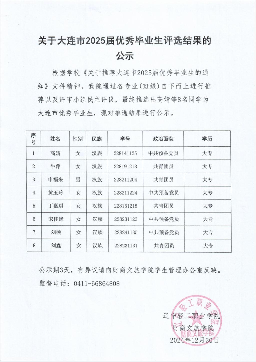 关于大连市2025届优秀毕业生评选结果的公示