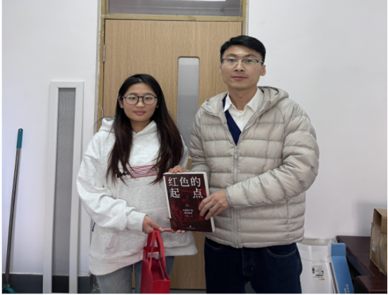 走访最后,党员教师们向实习的员工党员赠予了党总支精心准备的定制文具套装和《红色的起点》书籍,并对员工党员提出叮嘱,虽然现在是实习期间,但同学们依旧是员工身份,特别要铭记党员身份,要时时刻刻以党员标准要求自己,争做甘奉献,敢担当,有作为的新时代青年。