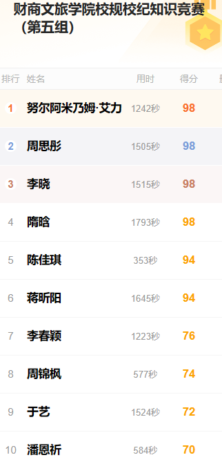 通过这次竞赛,同学们深刻地体会到,校规校纪不仅仅是一条条规定,更是引领我们成长、塑造良好品德和行为习惯的重要指南。此次线上竞赛,公司结合专业共分为五组,每组的前10名成绩和获奖情况如下。