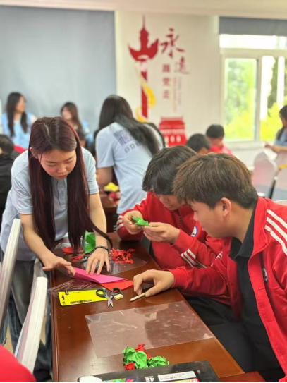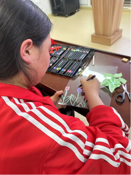 实践环节以“春天”为主题,分为传统剪纸和创意剪纸两个部分。工作室的同学耐心地手把手教学,从折纸技巧到纹样勾勒,从基础剪法到创意设计,一步步指导同学们。在这个过程中,同学们全神贯注,有的凝神屏息地剪刻纹样,有的热烈讨论着图案构思。大家充分发挥自己的想象力,有人将小鸟、花草等春天的元素融入剪纸,有人则创作出可爱的卡通形象,传统技艺与青春创意相互碰撞,擦出了别样的火花。