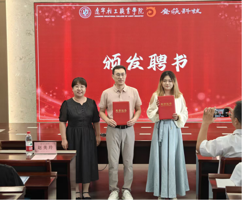 在“魔筷直播现代学徒制班”启动仪式上,李宝刚部长、于洋总监、董欣雨经理与赵美玲经理、张荣主任、孔涛老师共同按下启动按钮,标志着校企深度融合、协同育人的新阶段正式启航。随后,赵美玲经理隆重为于洋、董欣雨两位企业专家举行了企业导师聘任仪式,正式确立“双导师制”育人体系,由企业导师与公司导师共同肩负起培养符合行业需求的实战型人才的重任。