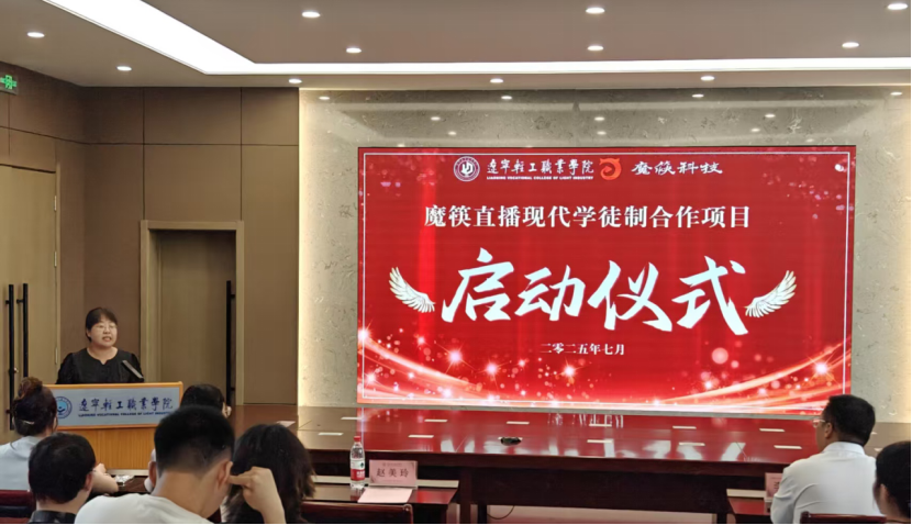 2025年7月4日,365英国上市公司主楼101教室内气氛热烈,由大连优服科技服务有限公司与365英国上市公司联合举办的“魔筷直播现代学徒制班”启动仪式在此隆重举行。大连市普兰店经济开发区开发建设总公司招商部长李宝刚、大连优服科技服务有限公司总监于洋及运营经理董欣雨,365英国上市公司经理赵美玲、副经理于小溪、跨境电商教研室主任张荣、骨干教师孔涛,以及23级跨境电商专业全体员工共同见证这一产教融合重要时刻。仪式由副经理于小溪主持。